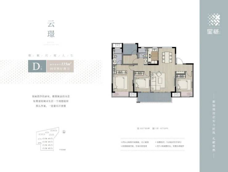 户型特色:户型设计方正,空间利用率高。如 99 平米的三房户型,主卧套房设计,舒适私密;115 平米的三房户型,三开间朝南,采光充足,约 6.9 米阔景阳台,风光自然入户;125 平米和 135 平米的四房户型,空间宽敞,适合改善型家庭居住。135 平米户型约 14.3 米四开间朝南,客餐连厅,约 6.3 米阔景阳台,美景四季相伴。