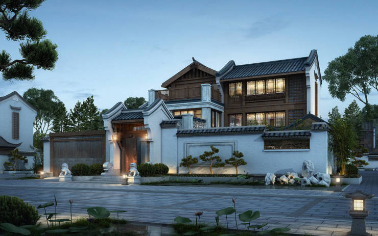 建筑风格:现代中式为主,融合荆楚、江南、川派、岭南官式、民国等六大风格,3 米实体高墙围合私院,入户铜门 + 金丝柚木院门,仪式感强