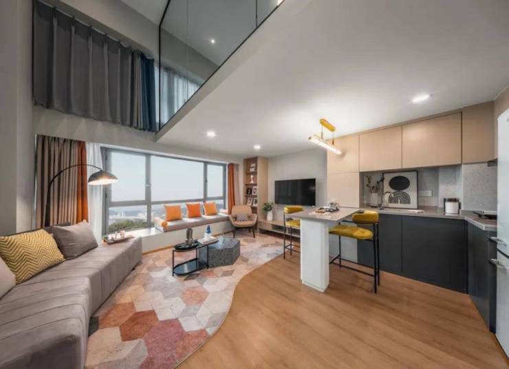 丽格·M5公寓以约4.5米挑高格局,让你买一层享两层。楼上设置书房和卧室,闲暇之时,这里就是你的诗与远方;楼下设置厨房客厅,日常之间,这里就是你的人间烟火。