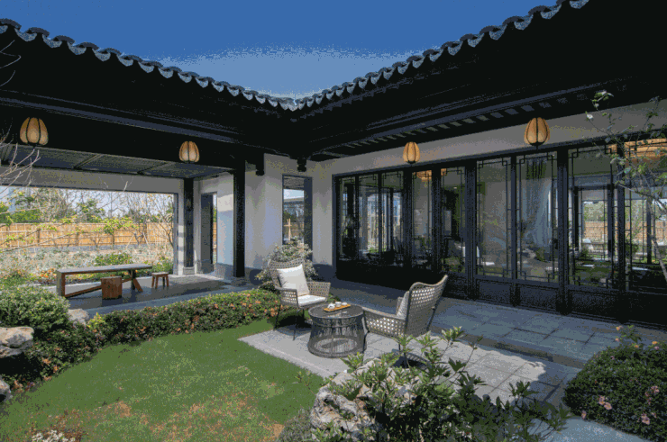 新宋风建筑美学传承江南白墙黛瓦、飞檐翘角的传统元素,结合现代玻璃幕墙与金属线条,形成 “水墨江南” 意境。合院采用 “三进归家” 礼序(院门 - 宅门 - 入户门),部分户型配备风雨连廊,串联庭院与室内空间。