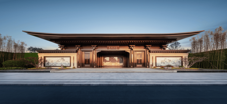建筑风格:以唐风宋韵为蓝本,采用歇山顶、飞檐戗角、万字纹花窗等传统元素,外立面选用葡萄牙米黄石材 + 铝板,呈现 “王府大宅 御鉴盛唐雅宋” 的恢弘气度。