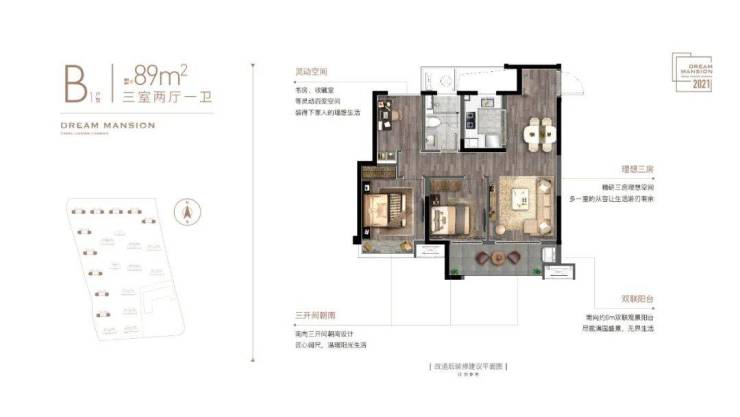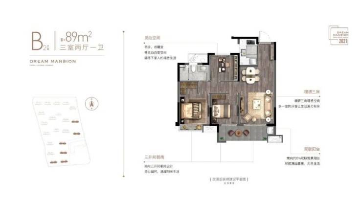 以及89㎡中间套三房,动静分离,三开间朝南,超长景观阳台。