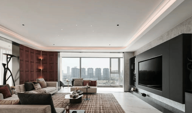 建筑设计:曲面瀑布屏搭配金属铝板,打造出 IMAX 级巨幕观景视野,勾勒出国际质感人居。