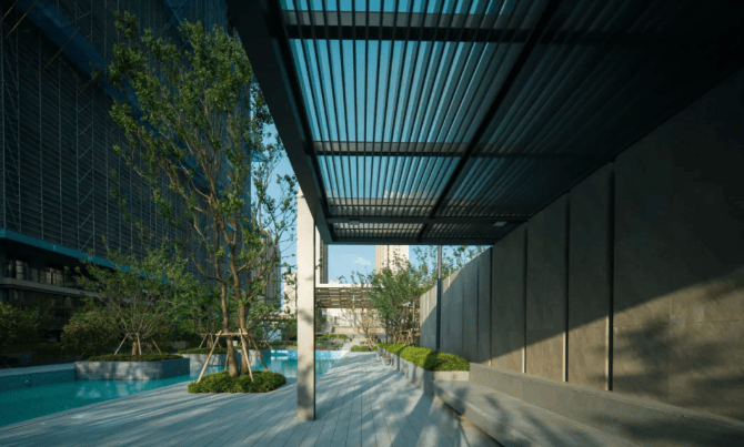 建筑品质:外立面以铝板+玻璃为主,占比超80%,搭配深灰色铝板线条和蓝灰玻璃,现代感十足。室内精装选用霍尼韦尔、弗兰卡等国际品牌,注重细节,如隐藏式承重轨道推拉门、卫生间干区地暖、全加压供水等。