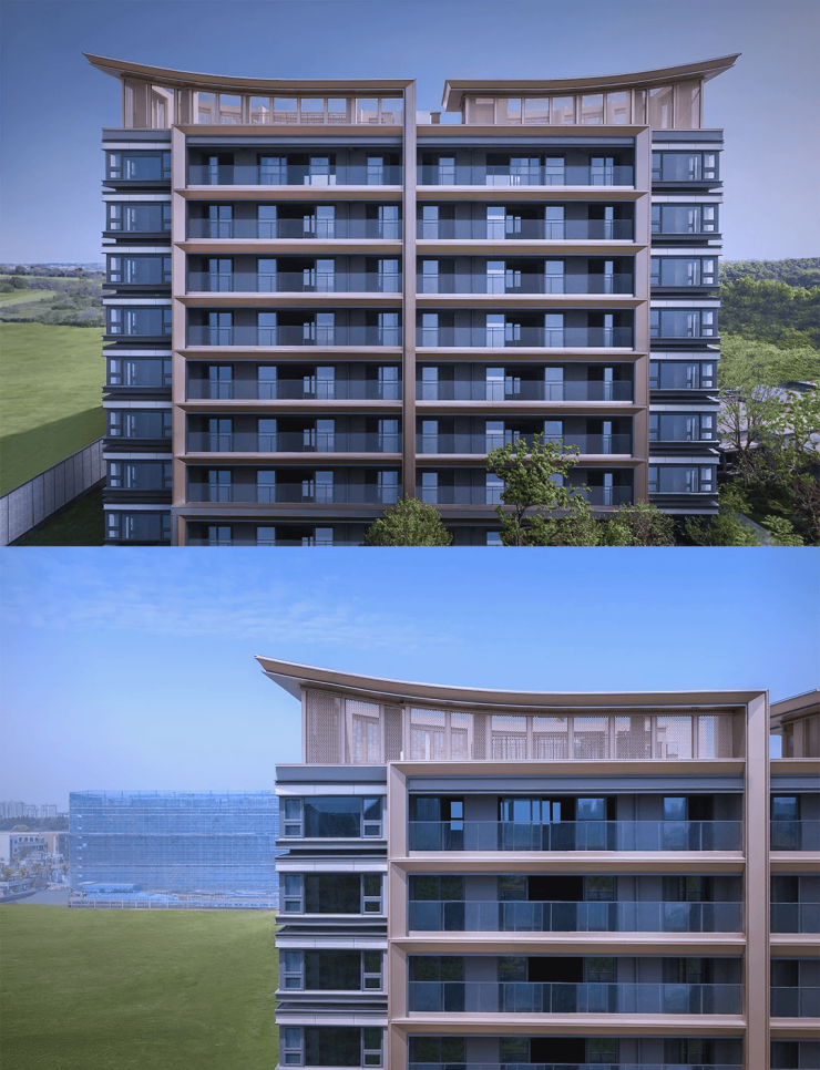 核心指标:占地约 6.6 万㎡,容积率仅1.2(超低密稀缺),绿化率 35%;总户数约 650 户;车位配比约 1:1.5;外立面采用仿宋式线条 + 石材基座 + 真石漆 + 大面积玻璃;