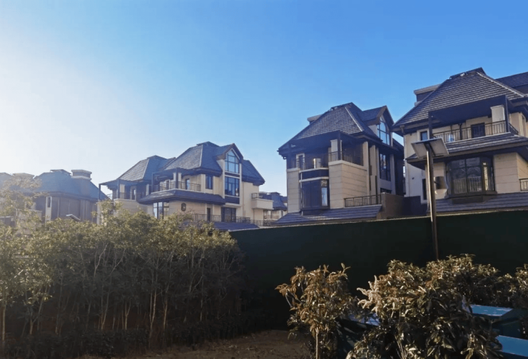 来看一下实拍图,别墅长这样:前排法式风独栋、后排英伦双拼~