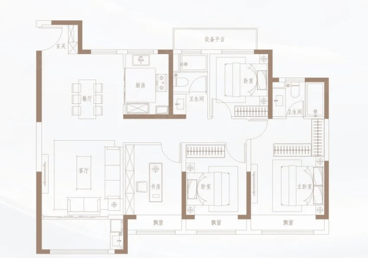138㎡户型开间阔绰,4室2厅2卫,三房朝南,均赠送飘窗。