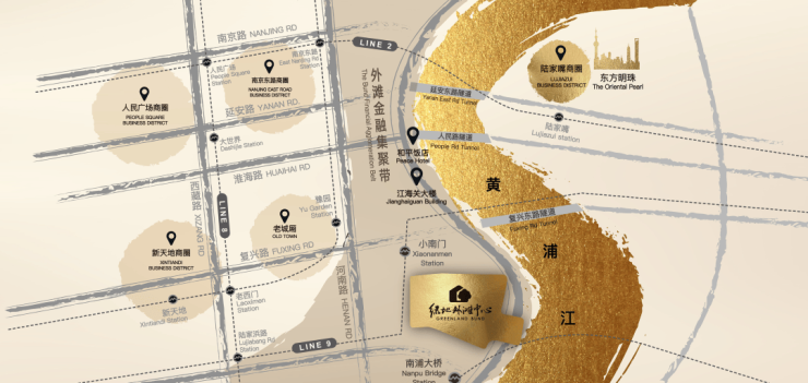 景观双轴:东西景观滨水轴—一轴三段,约1.8万m²中央绿地,立体景观连廊,滨水景观区,打通老城厢与滨江的联系通道,串联起项目整体二层步行系统;南北文化历史轴—北接十六铺码头,紧邻老城厢里弄文化建筑群,南延伸至南浦公园、董家渡天主教堂、商船会馆、艺术中心,造就城市文化高地;