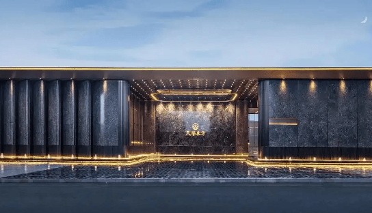 外立面:四面全铝板幕墙(香槟金 + 银灰)+ 大面积落地玻璃