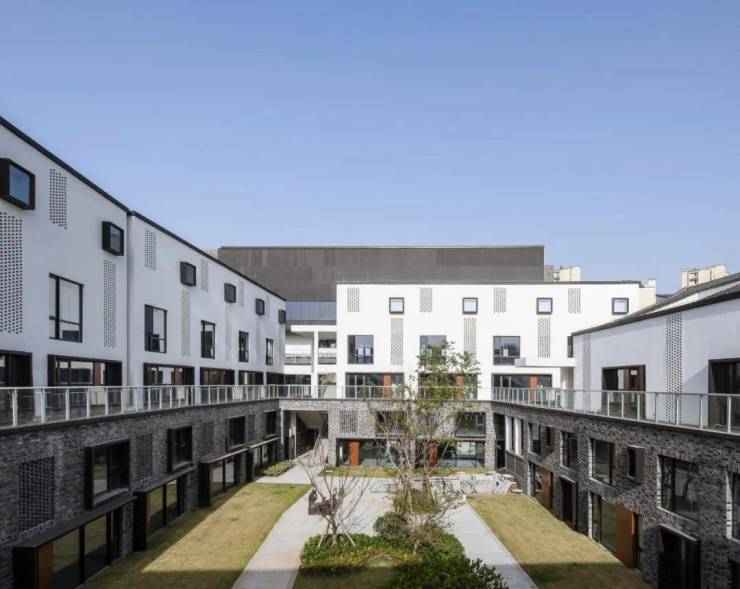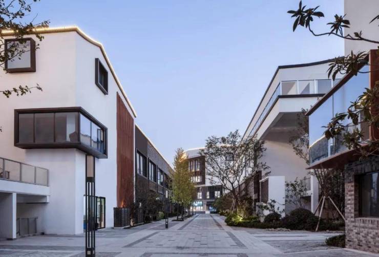 粉墙黛瓦,灰白的石板铺地,配上青砖、花格和木色门扇,使得整个建筑群落有了江南的韵味,局部点缀了市井气的雕塑,更是增添了一份趣味。