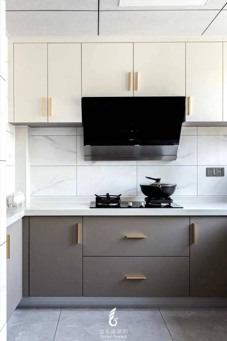 ② 原本的厨房位置较小,餐厅处拆掉多余墙体,借用一部分空间,保障了厨房操作空间,便于内置冰箱和蒸烤箱。