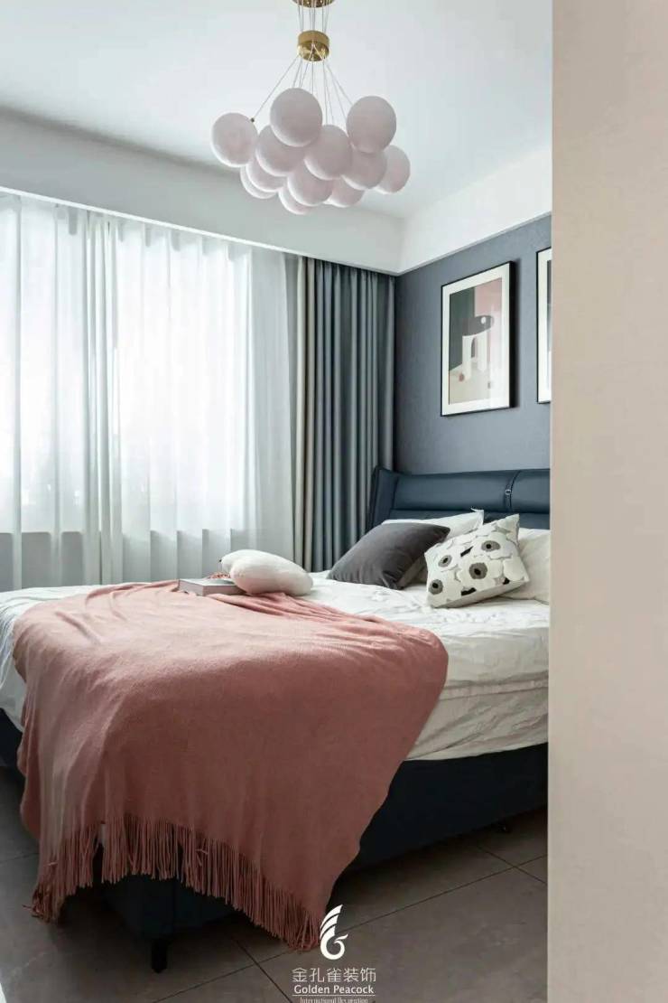 主卧和次卧室床头墙都采用深蓝色背景,布置同色系带皮艺靠背床,搭配洁净的灰白色床品,使得卧室空间显得安静舒适而优雅大气。