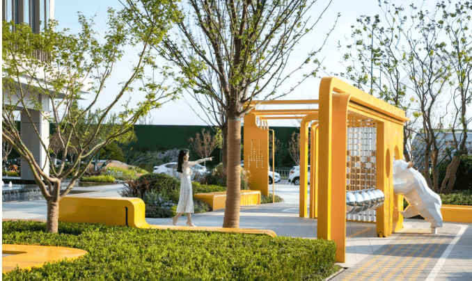 黄色装置界面串联地标入口、互动装置、休憩座椅、网红打卡等空间,呈现出活力、串联、互动、质感的商业氛围,各个功能之间不再有明确的边界,更为交融休憩场空间,线性带状灯光结合草坪麦穗灯具,提升场地的商业活力氛围。