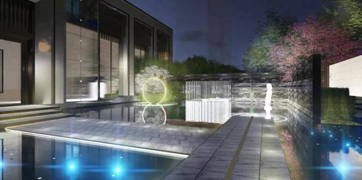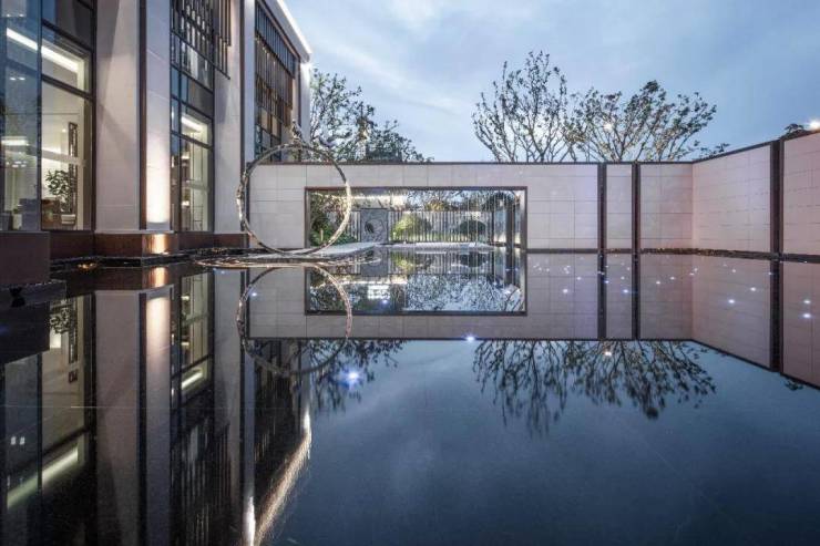 沿着入口来到中心水景花园空间。设计师借鉴“桥式”景观步道,打造滨水小径;镜面水中星光点点,夜间漫步于此,犹如漫步星空;于水景中植一株迎客松,树下水面晕开涟漪,尽显“简臻”韵味;“比翼鸟戒指”雕塑立于水面,水中喷雾蔓延,沿着其平静宽阔的水平面眺望, 让人拥有一种置身仙境中的错觉。