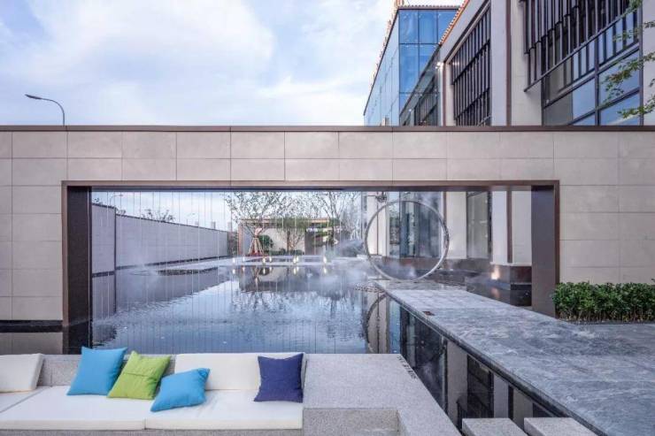 简洁、舒朗、怡然自得的生活情趣意味在后场空间的组织里展现得淋漓尽致,将地域、古典文化融入住区中,打造一处富有地域特色的景观。售楼处后场对景墙采用“比翼鸟”羽毛的元素,在空间进出有限的条件下,设计师运用简单的线性元素勾勒出一面立体照壁,羽毛、光影、灯光的组织,一实一虚,使得整个空间洋溢出大气、雅致的气息。
