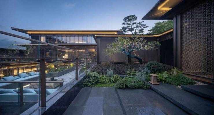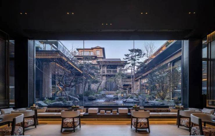 建筑风格:以新宋风为特色,融入超山宋梅古韵的历史人文底蕴,外立面采用香槟金铝板、蓝眼睛石材与玻璃幕墙,搭配歇山重檐、纳福悬鱼等传统元素,既保留宋式建筑的对称美学,又赋予现代建筑的轻盈通透。