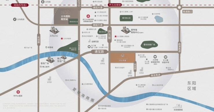 双主干道:项目毗邻通宝路与开元街两大交通主轴,贯通城市东西,快速通达义乌主城中心;道路距离约2.3公里处有义乌绕城高速廿三里高速收费站,可快速到达义乌各处和周边各大城市。规划中的轻轨4号线贯穿廿三里,多维度立体交通路网满足不同人群多样的出行方。
