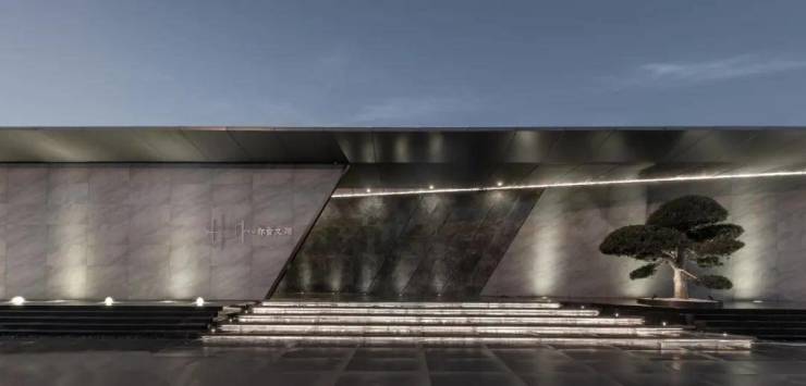 将外围空间界面化零为整,墙体与门厅做了一体化设计,延展成70余米的展示界面。并有意识的将一面墙进行倾斜和退让,让内外空间隐约渗透。半藏的空间与精细化手法强化了进入门厅的美好期许,顿足内望,隐见清泉潺潺,松枝苍劲,心理变化油然而起。