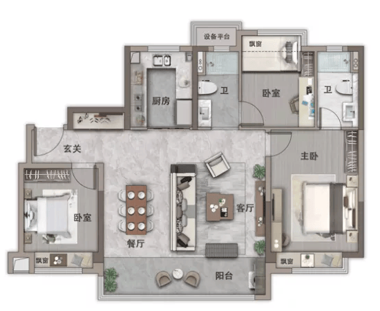 霁月↑,建筑面积约125㎡的三室两厅两卫,四开间朝南,宽景阳台,空间规划更为灵动;