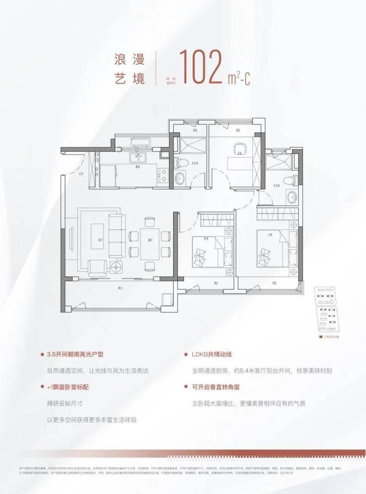 特色二:约5.5米双开间大阳台加大空间尺寸感,项目安排上了全屋飘窗,而且设计了双开间Plus大阳台。在大部分百平三房还只有约3.5米长的阳台时,这个项目把阳台拉长到了约5.5米,在视野上更开阔。正对次卧的阳台等于一个小收纳空间,洗衣机、烘干机,花架都可以放在阳台上。同时很多家庭面临的阳台杂物影响美观的痛点也可以迎刃而解,把衣服晾晒在次卧阳台一侧,客厅看上去就更加整洁了,采光也不会受到影响。