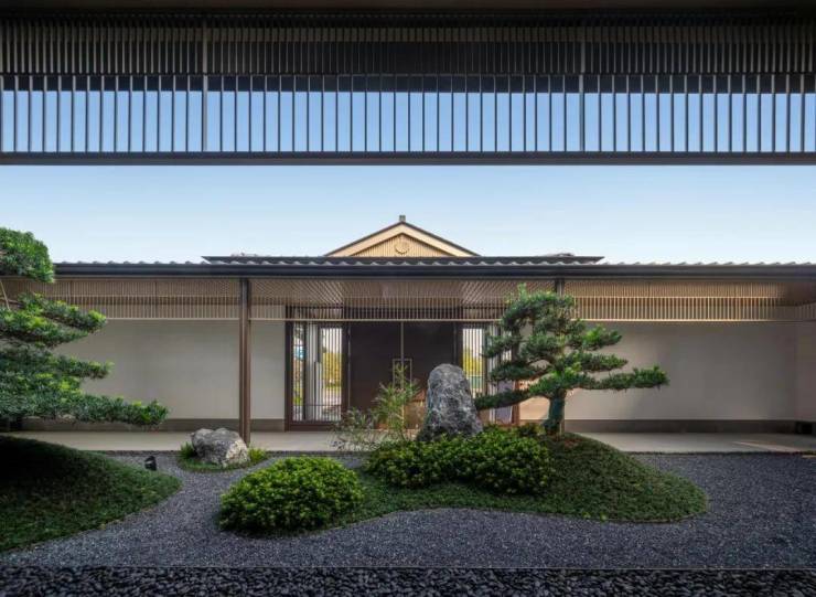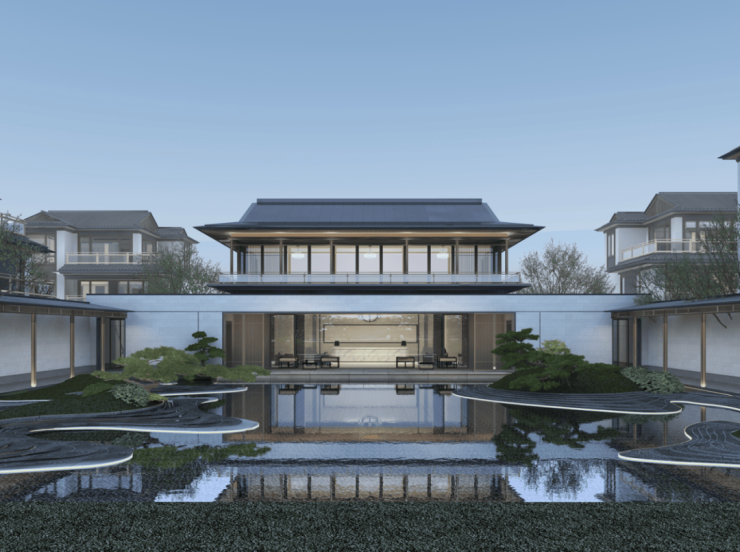 沿江入口引入水园,形成入口水院空间,加入曲折的路网以及搭配新中式园林绿植,一副勾栏瓦舍、阡陌巷里、怡然自得的隐士桃源生活画卷缓缓打开。
