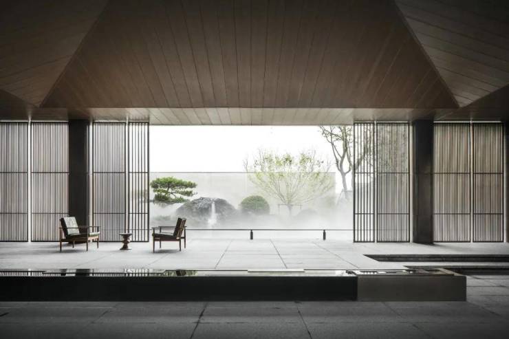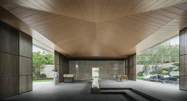 歇山顶下的接待花厅,由压低的檐口和格栅框景出纵深的视线牵引。室内排除了过多的结构冗余,形成无阻隔的轩敞空间,木纹铝合金扣板吊顶带来温暖优雅的感受。室内外30厘米的标高,以及位于花厅中央的“曲水流觞”水轴装置,将这154㎡的空间分隔成停留和通过两部分。