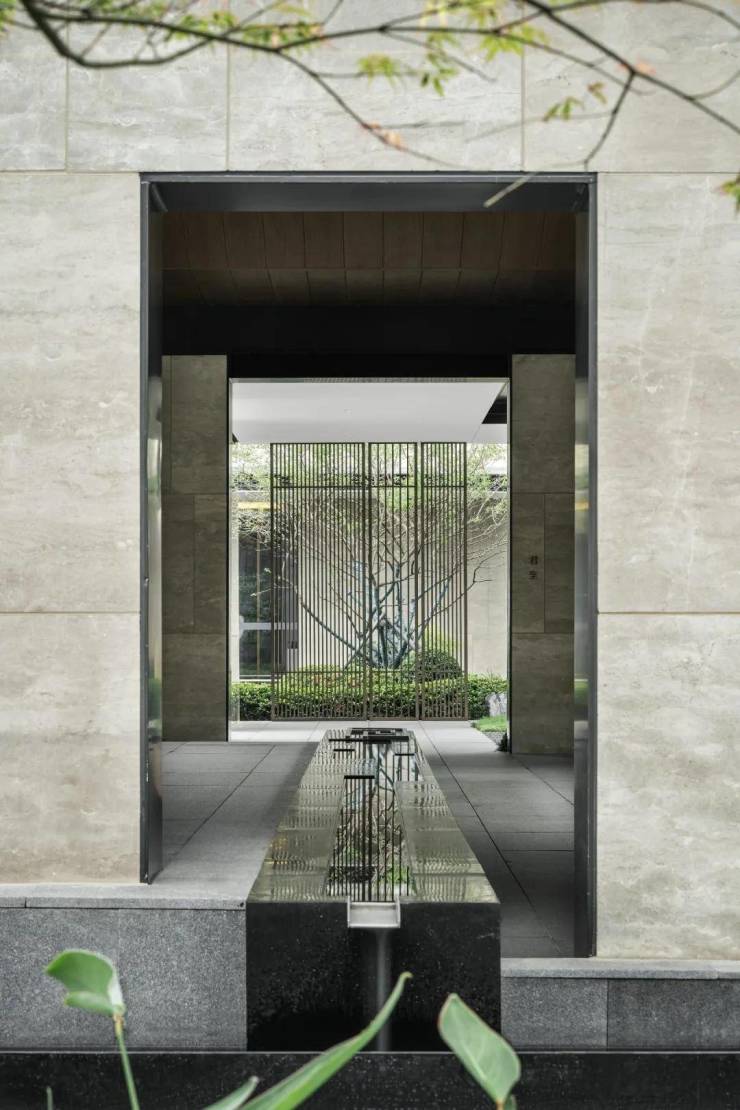 前场借会稽山为远景,在原有红线的基础上,将入口花厅和景墙进行了谦虚的留白退让,形成敞开式迎宾空间,东侧浣江路的香樟行道树自然形成前景。将停车区设置于前场的北侧,引导来访者沿着路径望向视线尽头的会稽山。以宋代歇山顶为原型的入口花厅,高7.34m,檐口长18.4m,宽12m,与端景处的灌木球和迎客黑松,在水平延展的围墙前,构成一幅不施繁饰、自然典雅的中式画卷。