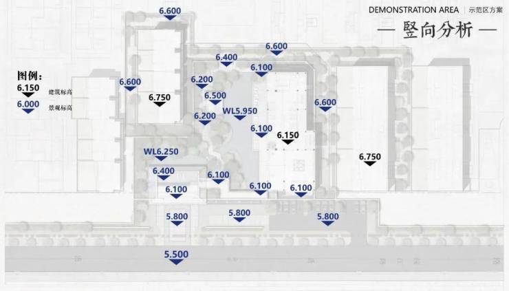 本次呈现的示范区位于“L”型景观主轴的东部起始处,是整个项目的主入口园林,属于“外园”,将来会被所有业主和外来消费的人群所共享。北侧的二层建筑暂时用作销售场地,在交付后将作为经营空间为本区域提供生活服务。由于近远期不同的使用模式,场地天然形成两条动线需求,在销售期两条动线相联成为一条体验和游园环线,在交付后则分为业主归家和经营空间两条内外动线。