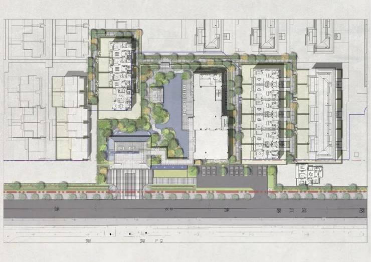 场地被组织成四进式递进空间,用景观场景叙事的游园手法将建筑、室内、景观串联起来。