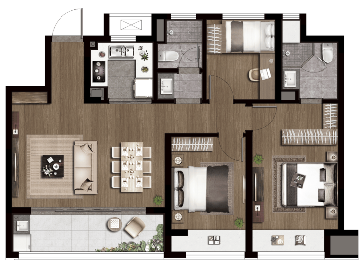 南向3.5面宽,在105㎡面积段做南向餐客横厅并连通景观阳台,是该户型加分项。公卫三段式卫浴设计,干湿分离;双卧朝南带飘窗,主卧套房