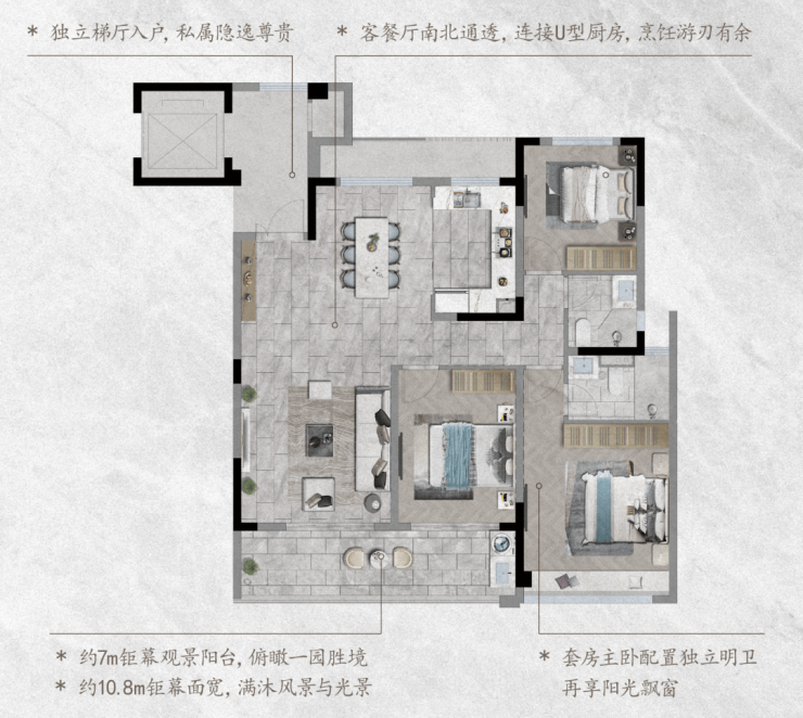 另一款明星户型,建面约149㎡则在观景面上做足功夫。