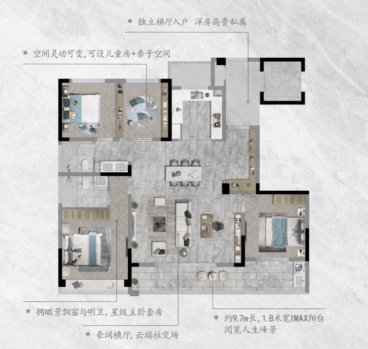 约9.7m长,1.8米宽IMAX阳台,加上约45㎡的大方厅,如此嘉兴市场开创性的设计,在保证采光及观景面更充足的前提下,让空气的对流也更加流畅,更大程度上提升了全屋的通透感。