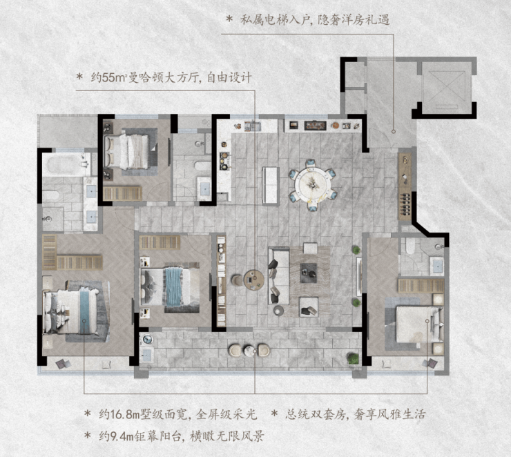 建面约179㎡约55㎡的曼哈顿大方厅,充分利用了过道的面积,把客厅的延展面做到最大。兼得“方正感”与“大尺度”,将客厅完全解放,任由你自由创作。