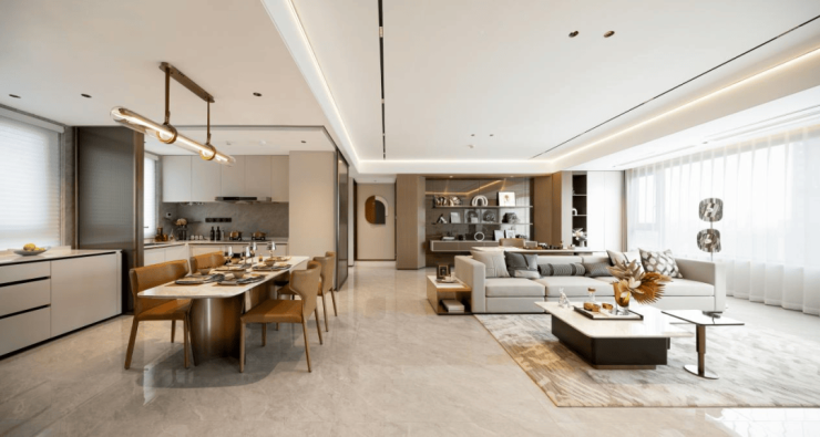 户型设计是天元鸣望邸的一大亮点,入市以来深受客户的好评。以建筑面积约144方的户型为例,约42方大横厅构筑宽阔舒适的社交空间,搭配约7.4米无敌观景面,将自然景观引入室内,以光影作画,成为客厅的点缀。而且户户层高约3.05-3.1米,为个性定制提供了更多可能。