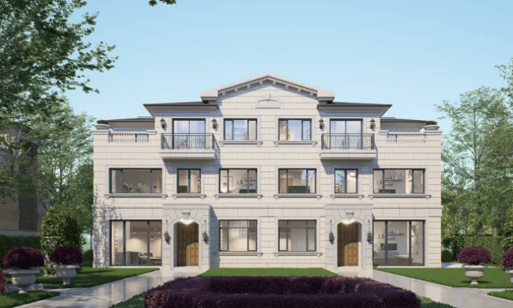 亮点:黄金麻石材立面、私家庭院、户均 2 + 私家车库、多采光窗地下室