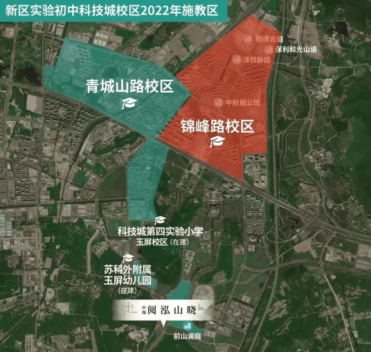 中海阅泓山晓北侧的苏科外附属玉屏幼儿园;科技城第四实验小学(在建);中学有新区实验中学科技城校区。另外除了公立的学校外板块内还有高端私立学校科技城外国语学校和伊顿国际学校为板块内的业主提供了更高端的教育需求。