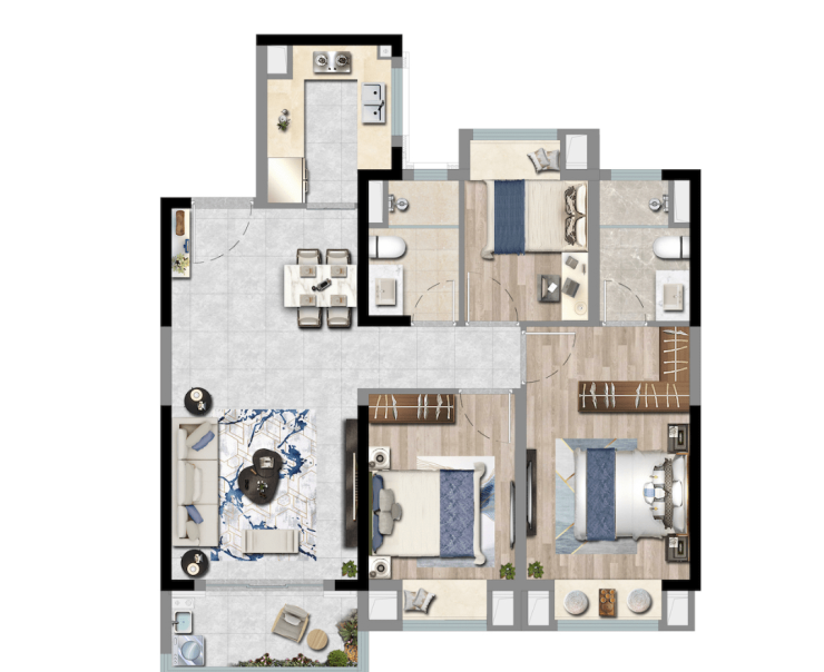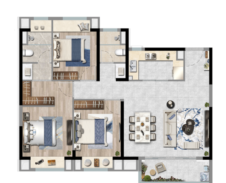 在售户型,无论是结构方正的建面约100~122m²精装三房、还是奢享三面瞰景建面约122m²宽幕高层,上实城开坚持从细节出发,最大化地诠释了「望海归心」的居住价值: