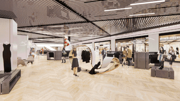 购物中心首层的设计回溯到古典时代城市中央大道,车马花灯驶过周日清晨的街道,街坊老少隔着街道闲聊;二层的过道是邻里相望的露台,家长带着孩子在露台上看巡演,仿佛从不远的未来回看当下的美好场景;三层的走道是时空穿梭之廊,金属质感和明快色彩创造出超越现实的氛围,仿佛置身未来世界。富有亲和力的公区使人倍感舒适,高品位有调性的商铺让人漫步流连,在这里,每个人都自在随心。