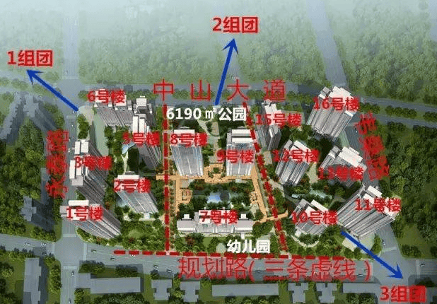 楼栋布局:小区共 14 栋 20-52 层的小高层和高层住宅,分为 S1、S2、S3 三个组团,楼间距最宽达 150 米,61%为看江户型。