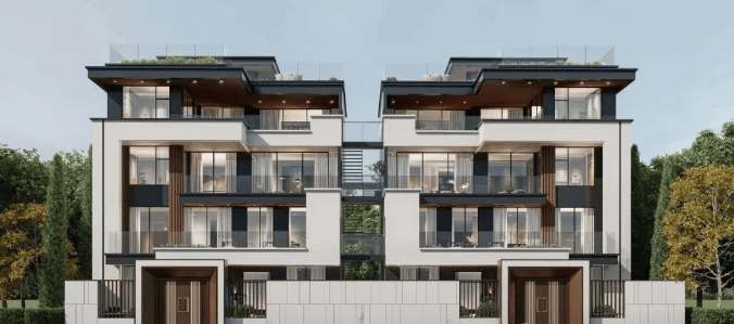 外立面:采用高级灰和白色经典搭配,穿插古铜色的铝板提升质感,大面积使用落地窗和露台,呈现出现代简约的光感外立面,使建筑更灵动轻盈。
