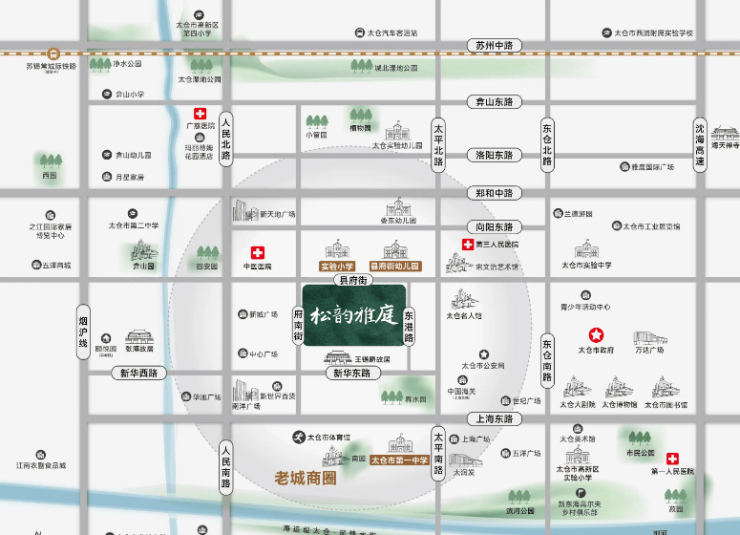 医疗:太仓市中医院(三级乙等)、太仓市第一人民医院等优质医疗资源环伺,2 公里范围内可满足日常就医与专科诊疗;