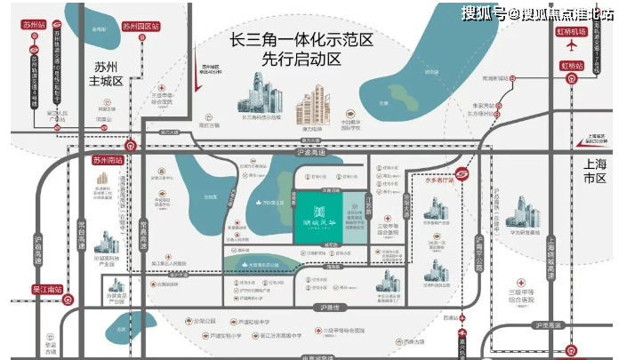 交通配套:距苏州南站(在建)约 7 公里,2024 年建成后 20 分钟直达上海虹桥;规划苏州轨交 10 号线、上海 17 号线、嘉兴 3 号线三轨交汇。周边还有 G50 沪渝高速、G1521 常嘉高速、常台高速,形成辐射上海、苏州、湖州的一小时经济圈。