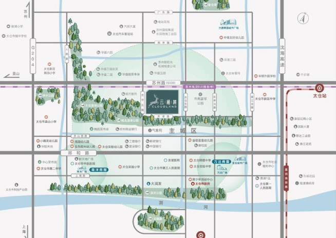 生态配套:距城北湿地公园约 100m,距太仓湿地公园约 1km,还有净水公园及沿河生态带,上万株市政樟群形成城市天然生态氧吧134。