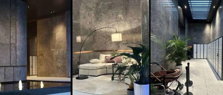 入口空间更像一个沉稳的大型收纳装置,将地库管理、电梯出入、人行管控、快递管控、生活吧台等功能容纳其中。而大面意大利灰大理石的使用,铺陈出沉静与雅致的氛围气息,屏蔽着城市的喧嚣。