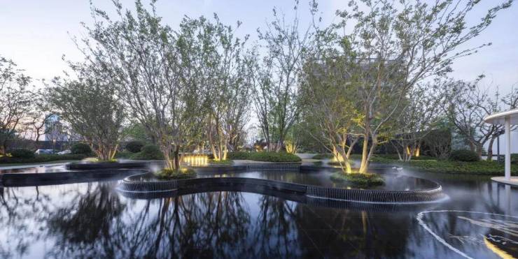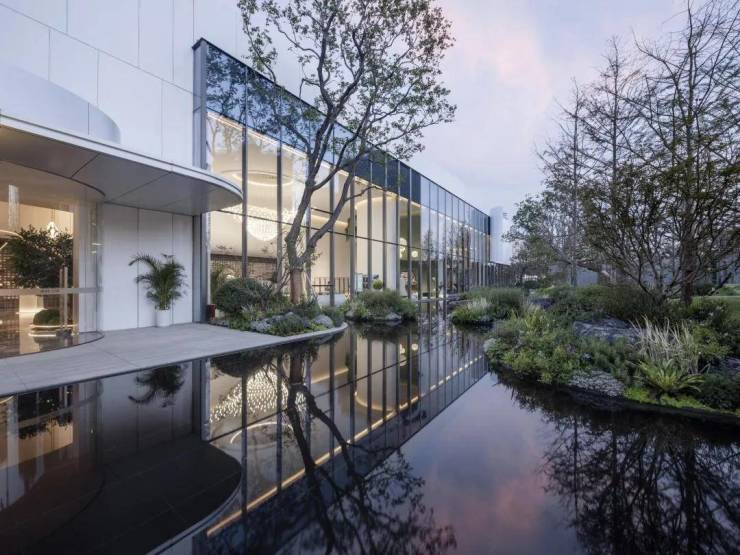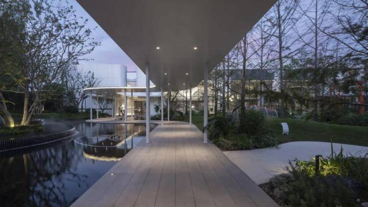轻薄的风雨连廊串联起酒店式大门与未来的会所,池水在阳光下晶莹剔透,泛起的秀色,映出一片明净。水景跌落的轻语,树梢轻微的摇曳,更像轻风送来的怡然安宁。
