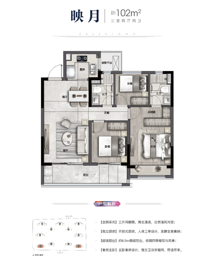 项目规划有住宅和商业两大板块,商业板块5000㎡,为业主及片区居民提供购物、餐饮、娱乐一站式的服务;住宅由10栋小高层组成,建面约103-130㎡精工成品,奢阔景观视野,多阳台,多飘窗,在满足基础功能性需求的同时,细节的考量功能空间,收纳空间,进一步升级了业主居住舒适感。
