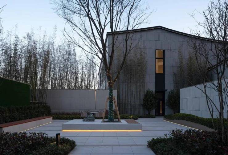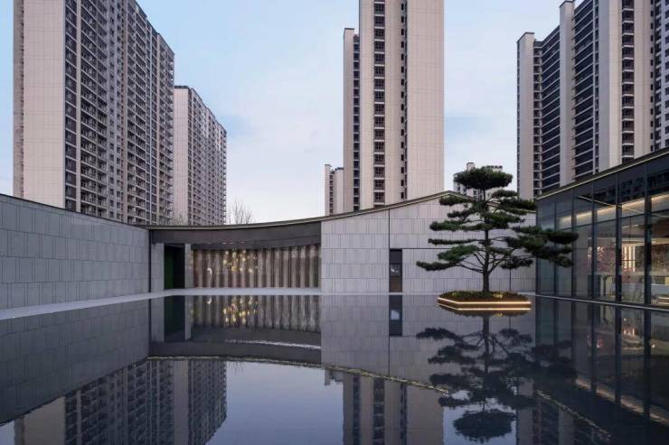 湖滨铂悦花园 ·生活美学馆,其景观艺术追求纯粹、简约、灵动的美学调性,这与建筑简洁、轻盈、留白的设计手法相呼应和统一。空间布局上以水为线索,通过现代手法重塑诗意江南的肌理与格局,剥离喧嚣,追求幸宁静祥和、幸福静谧之美。
