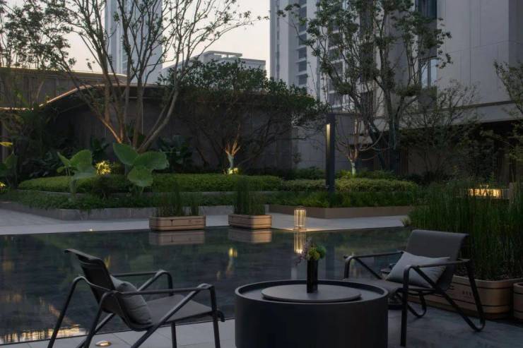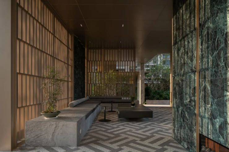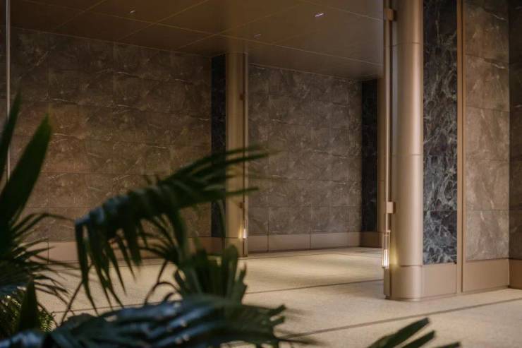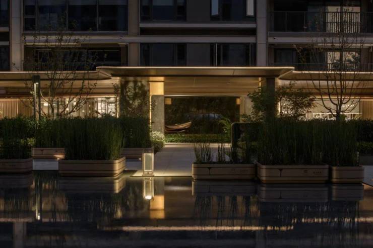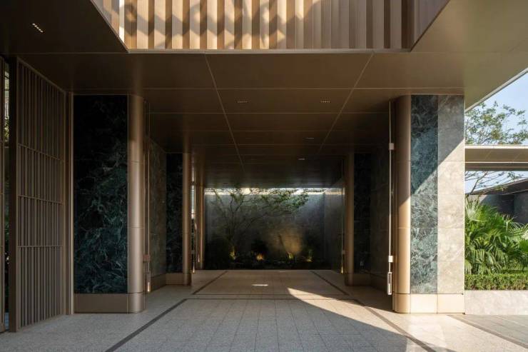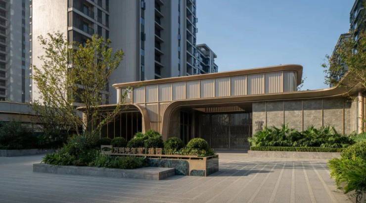 建筑设计:社区入口以万科经典的 V 形字符为灵感,打造环岛落客区,两层立体造型搭配弧形顶冠,采用希腊灰、普拉达绿奢石岩板与琥珀金铝板,尽显尊贵;车库入口采用希腊灰奢石岩板、铝板与金属格栅打造,坡道设发光灯膜,营造梦幻归家体验。