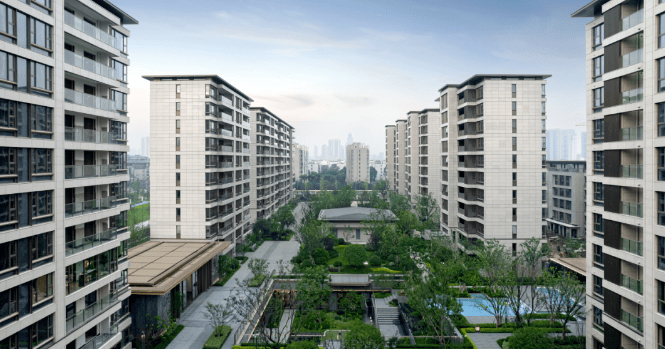 建筑规划:小区涵盖 10 栋 5-6 层花园洋房和 13 栋 5 层叠墅,建筑采用全石材干挂外立面搭配香槟金金属线条,质感十足。洋房为精装交付,叠墅为毛坯交付,洋房做到一梯一户,叠墅带有私享庭院。