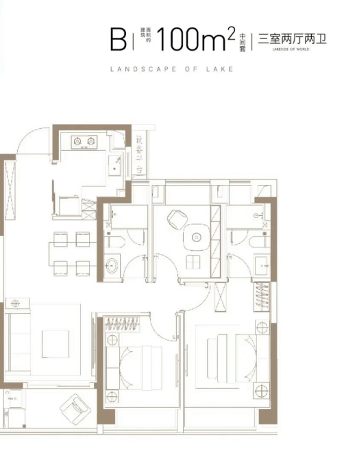 建面约 100㎡的 3 房 2 厅 2 卫户型:做到了三开间朝南、主卧套房设计、动静分离、全卧室带飘窗,功能性和尺度感完美结合,能满足业主从二人世界到二胎家庭的全生命周期需求。